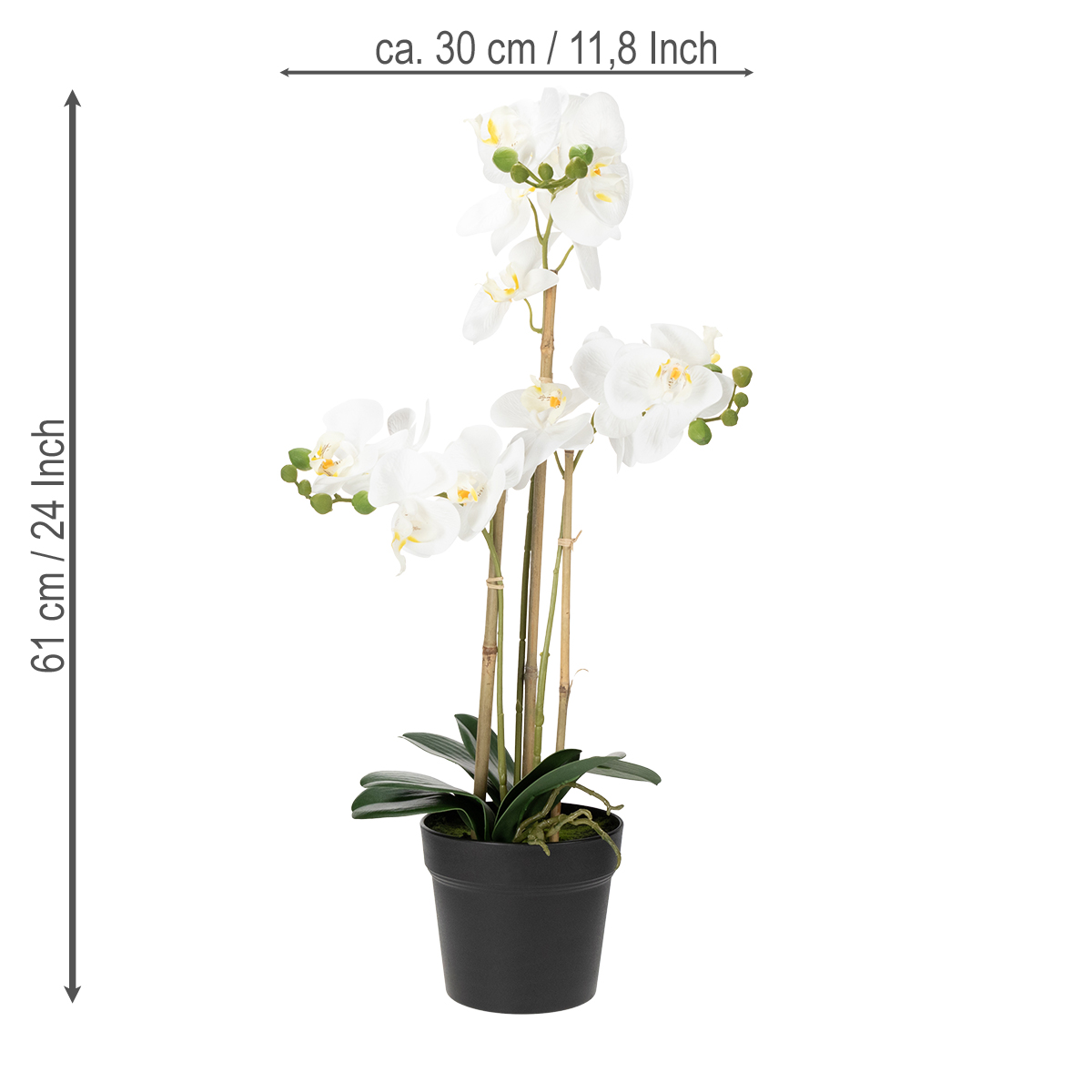 Nasz wysokiej jakości sztuczny storczyk z łatwością doda odrobinę stylu. Kompozycja składa się z trzech eleganckich, białych łodyg kwiatowych ozdobionych małymi, zielonymi pąkami. Całość bezpiecznie spoczywa w czarnej doniczce, która dyskretnie wpasuje się w każdy wystrój wnętrza. Sztuczny kwiat wykonany jest ze starannie wykonanej tkaniny i tworzywa sztucznego, co zapewnia mu nie tylko realistyczny wygląd, ale i trwałość. Szerokość i średnica około 25 cm idealnie pasuje do salonów, biur lub stylowych recepcji.