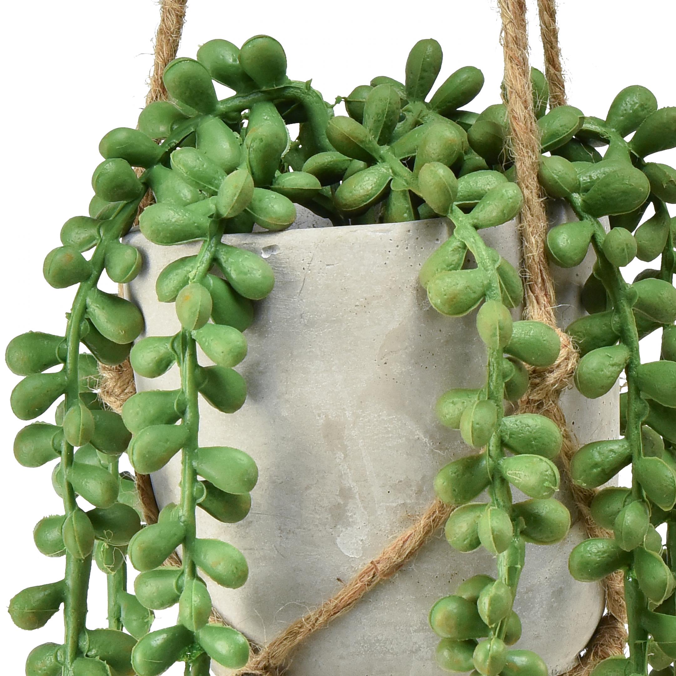Jeśli często wyjeżdżasz na długie podróże lub chcesz zawiesić wiszące kosze na drewnianych belkach dachowych, do których trudno jest uzyskać dostęp do podlewania, wiszący sukulent w wersji sztucznej to zielona końcówka dekoracyjna.