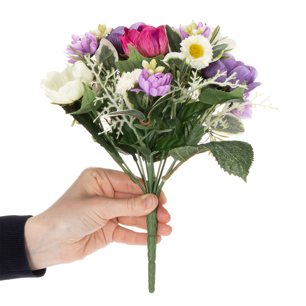 Bukiet ze sztucznych kwiatów, który jest nie tylko dekoracyjny, ale i zapewnia długotrwałą radość. Ten model, wykonany z poliestru i plastiku, stanowi trwałą alternatywę dla prawdziwych kwiatów i jest idealny dla każdego, kto chce cieszyć się radosnym urokiem wiosennych kwiatów bez konieczności ciągłego kupowania nowych bukietów. Żywe kolory – od delikatnej bieli, przez soczysty fiolet, po wyrazisty róż – sprawiają, że ten kolorowy bukiet ze sztucznych kwiatów przyciąga wzrok.
