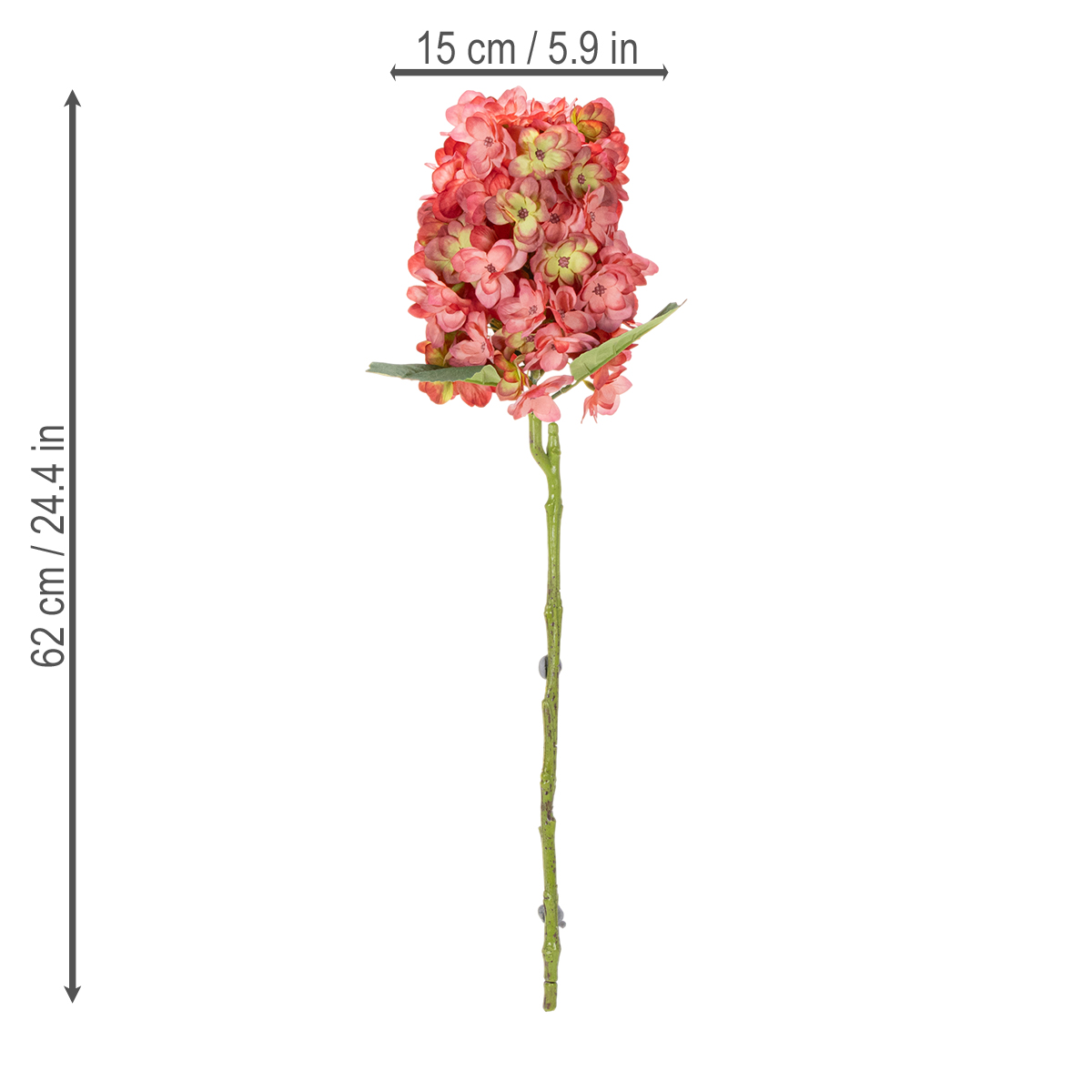 Ta sztuczna hortensja w kolorze różowym zachwyca nie tylko wysoką jakością wykonania z poliestru i plastiku, ale także wszechstronnością. Mierząca 62 cm wysokości i ozdobiona delikatnymi główkami kwiatów, idealnie nadaje się do wysokich wazonów, kreatywnych kompozycji kwiatowych lub jako efektowny akcent. Subtelne przejścia tonalne od różu do kremu nadają projektowi naturalny i harmonijny wygląd, który pasuje do każdego stylu, od nowoczesnego po rustykalny.