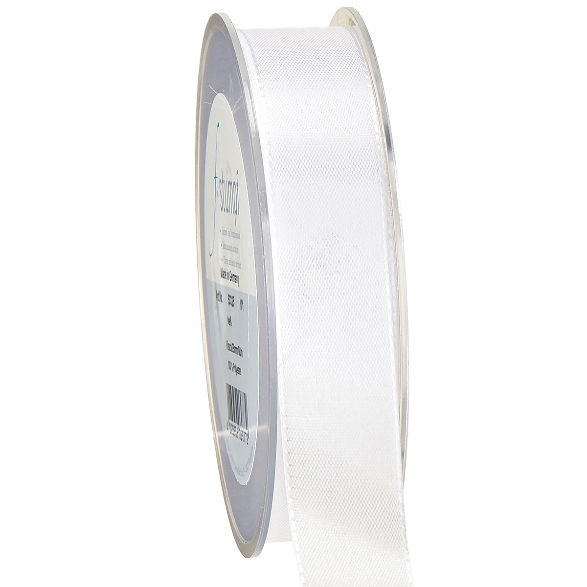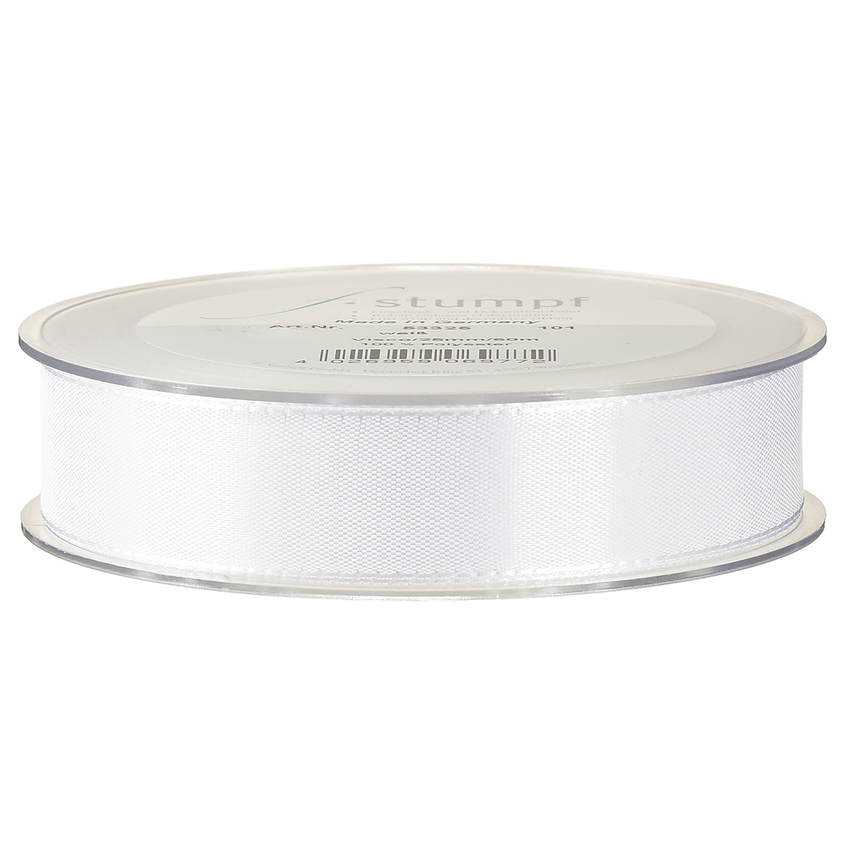 Biała poliestrowa wstążka dekoracyjna jest nawinięta na plastikową szpulę, którą można zawiesić, aby ułatwić obsługę. Ma szerokość około 25 milimetrów i długość około 50 metrów.