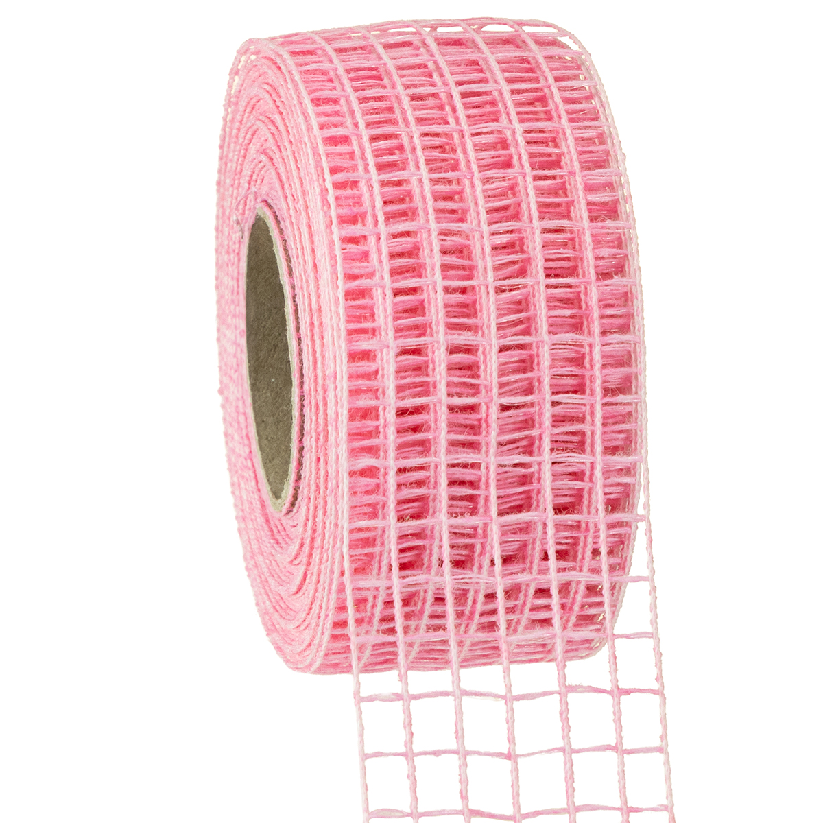 Taśma kratowa w kolorze różowym jest zwinięta w rulon i ma długość około 10 metrów i szerokość około 4,5 centymetra.