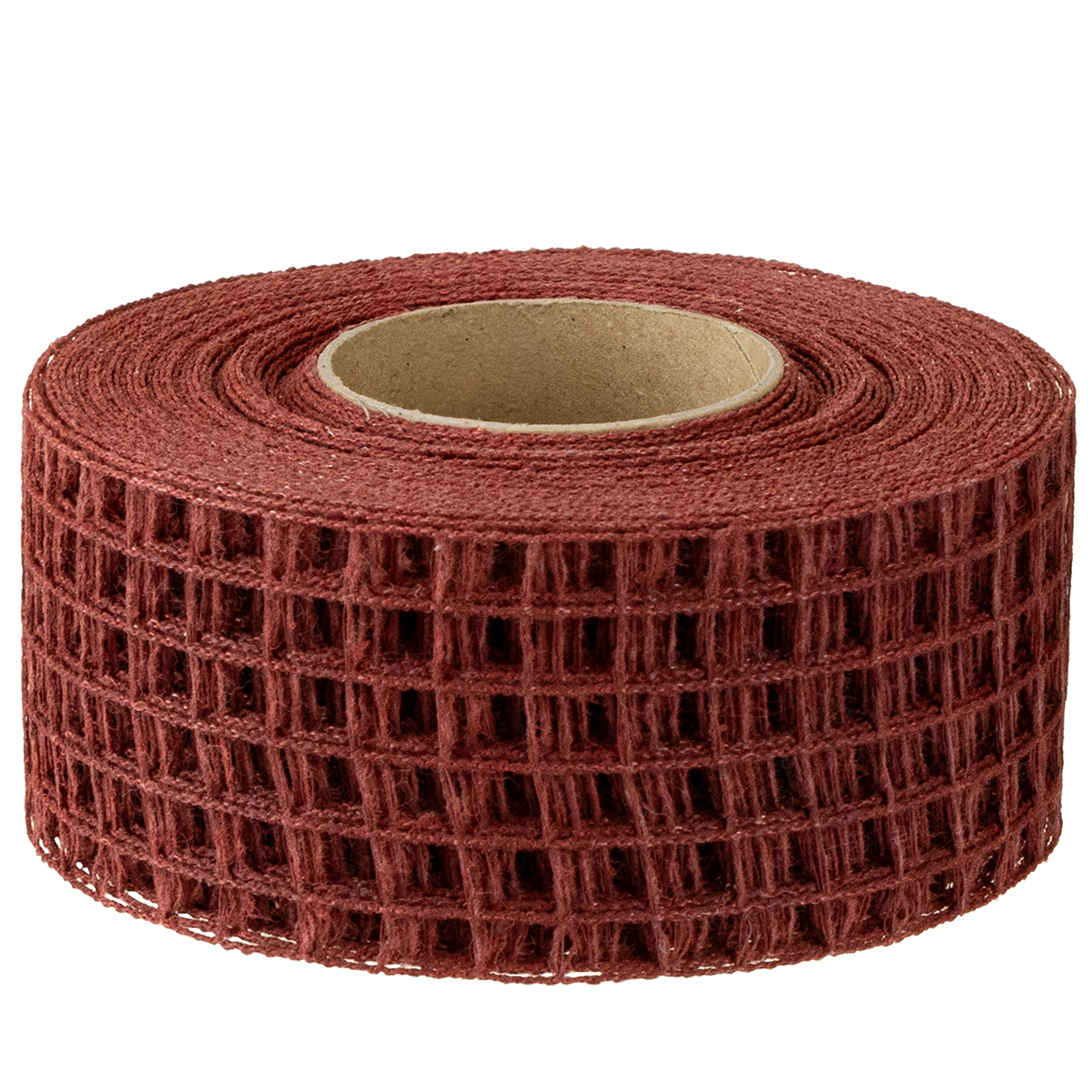 Taśma kratowa w kolorze Bordeaux jest zwijana w rolkę i ma długość około 10 metrów i szerokość około 4,5 centymetra.