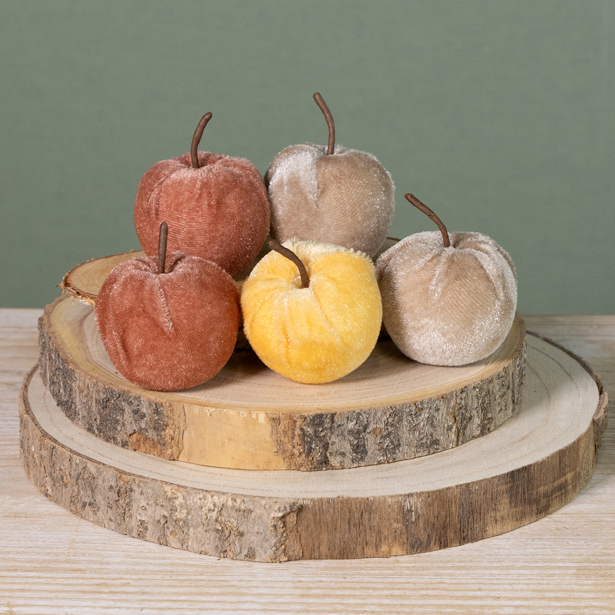 Nazwa produktu: Tkanina dekoracyjna jabłka jabłko aksamit brązowo żółty Ø5cm wys.6cm 12 szt.