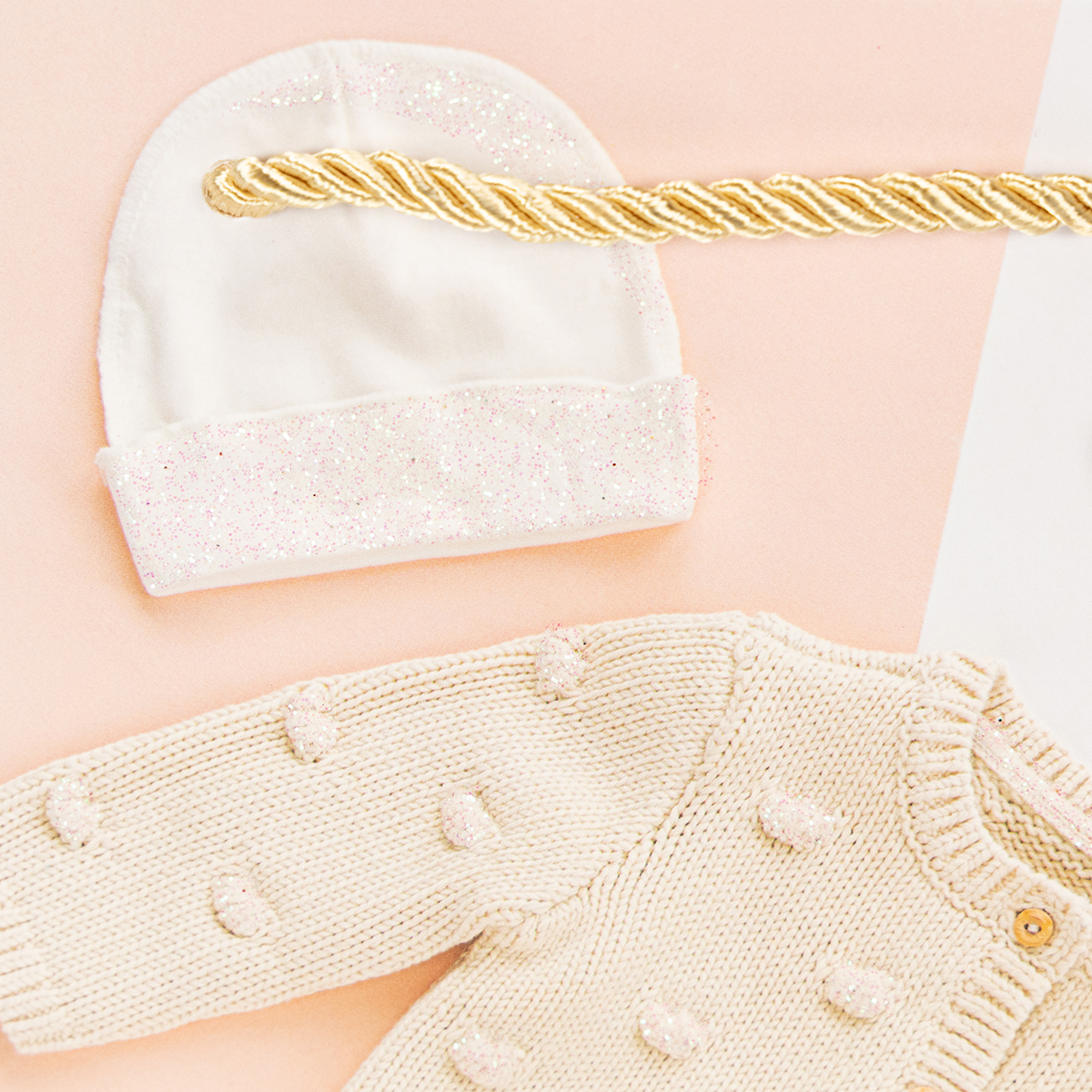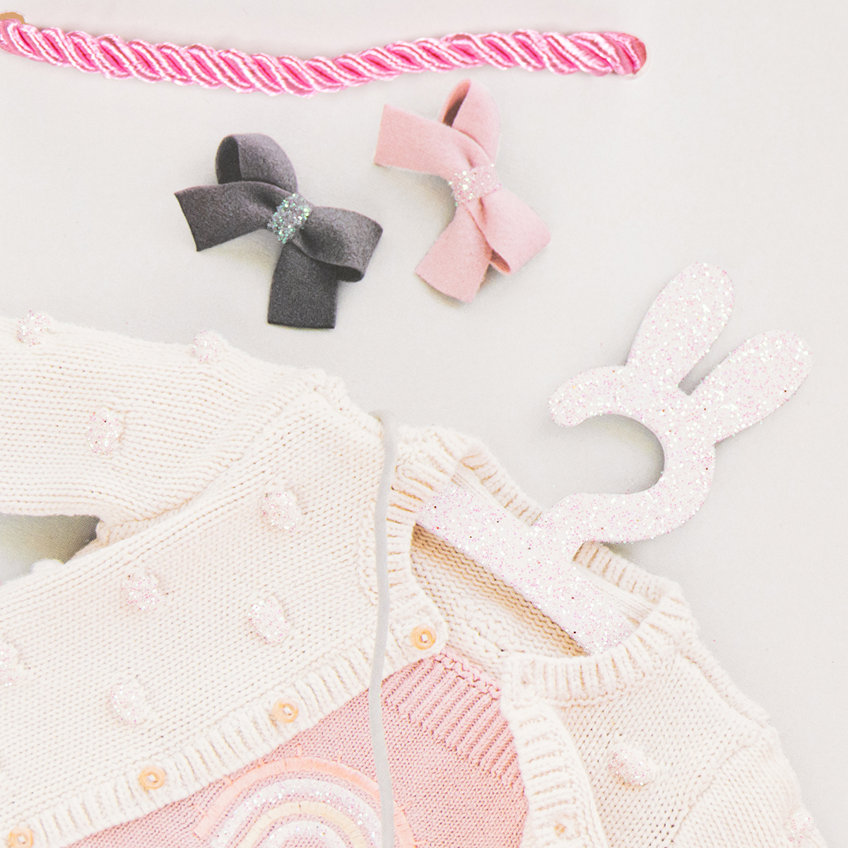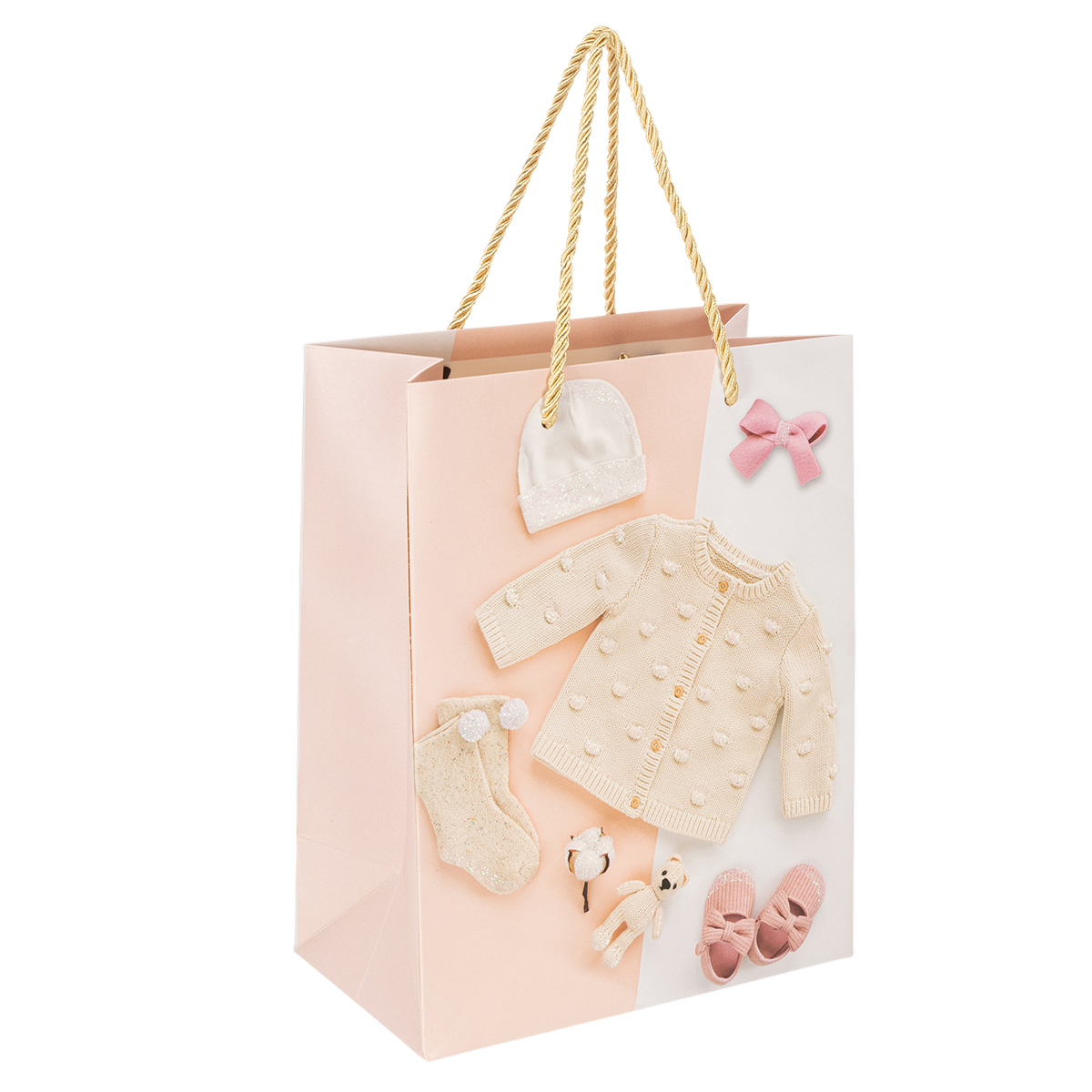 Torby na prezenty mają różnorodne wzornictwo i zawierają kardigany, buciki dziecięce, butelki i wiele innych uroczych akcesoriów dla niemowląt. Efekty brokatu na torebkach papierowych podkreślają szczegóły i dodają magii opakowaniom prezentów.