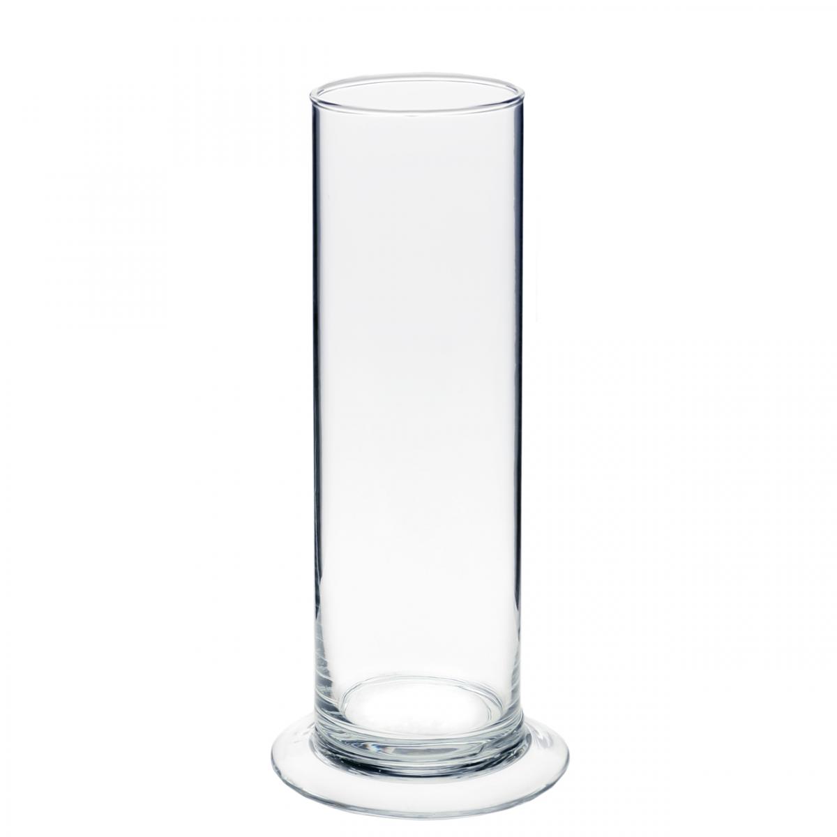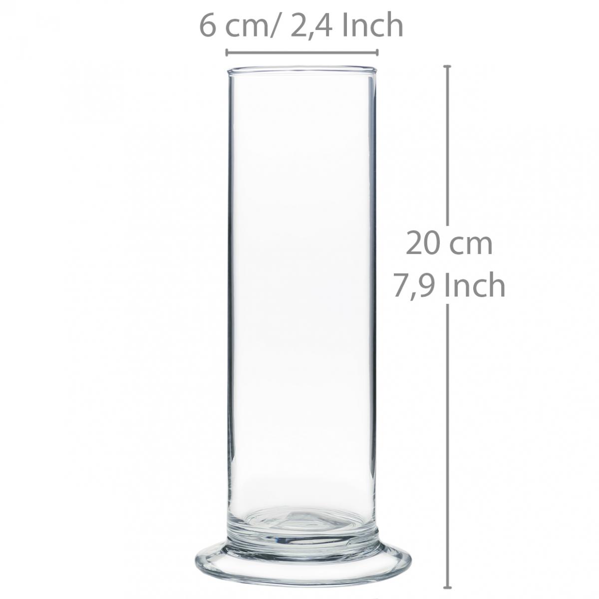 Smukły szklany cylinder z podstawą ma wysokość około 20 centymetrów. Średnica samego wazonu wynosi około 6 centymetrów.