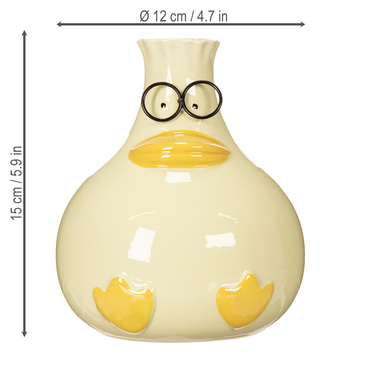 Te ceramiczne wazony w kształcie kaczek łączą w sobie fantazyjny design z wysoką jakością wykonania. Mierzące 15 cm wysokości i 12 cm średnicy, nie są ani za duże, ani za małe, dzięki czemu nadają się do wielu zastosowań. Solidna, ceramiczna obudowa nie tylko emanuje stabilnością, ale także wnosi radosny, energiczny akcent do każdego wnętrza dzięki delikatnemu żółtemu kolorowi. Nowoczesny design idealnie komponuje się z różnymi stylami wnętrz, od minimalistycznego i skandynawskiego po zabawny i uroczy pokój dziecięcy.
