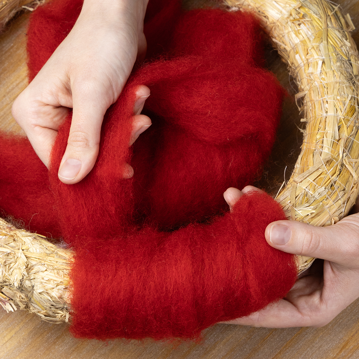 Szukasz świeżego pomysłu na dekorację stołu? Wystarczy luźno owinąć filcowaną wełną szklanki lub wazony, aby dodać im przytulnego charakteru. A może potrzebujesz świeżego spojrzenia na swój wianek? Owiń prostą bazę do wianka tą czerwoną wełną i zobacz, jak natychmiast nabiera życia i stylu! Wełna doskonale nadaje się również do florystyki – wykorzystaj ją jako bazę do kompozycji kwiatowych lub małych ozdób stołowych, aby dodać im objętości i elegancji.