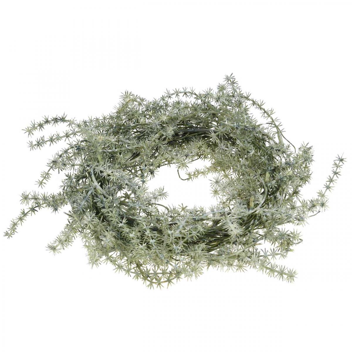 Dekoracja roślinna w kolorze mroźnej zieleni: wieniec modrzewiowy zachwyca sztucznie w tej biało-szarej wersji. Delikatny wianek dekoracyjny podkreśla gałęzie iglaste w bardzo zimowy sposób.