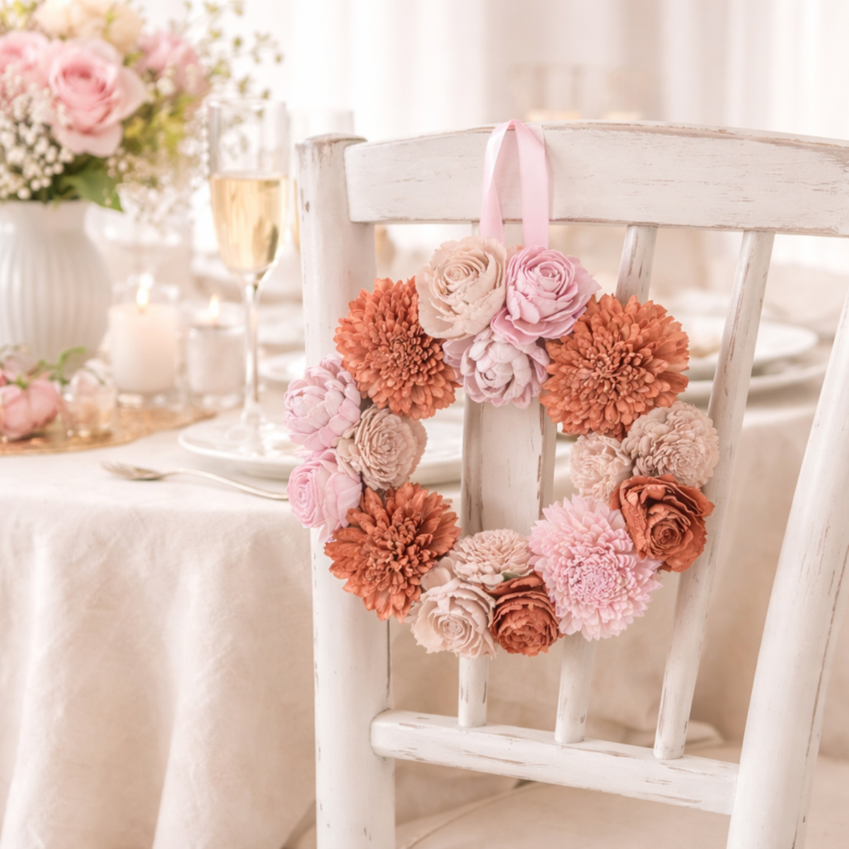 Ten wianek kwiatowy urzeka od pierwszego wejrzenia harmonijnym zestawieniem kolorów w delikatnym różu. Delikatne kwiaty, starannie wykonane z wysokiej jakości drewna sola, emanują realistycznym, a zarazem niepowtarzalnym urokiem, który zapewni długotrwałą radość. Wiszące wieńce kwiatowe, takie jak ten, doskonale sprawdzą się nie tylko jako dekoracja ściany w salonie, ale również jako dekoracja stołu na specjalne okazje. Szybko staną się prawdziwą atrakcją na Twoim weselu lub wiosennym brunchu.