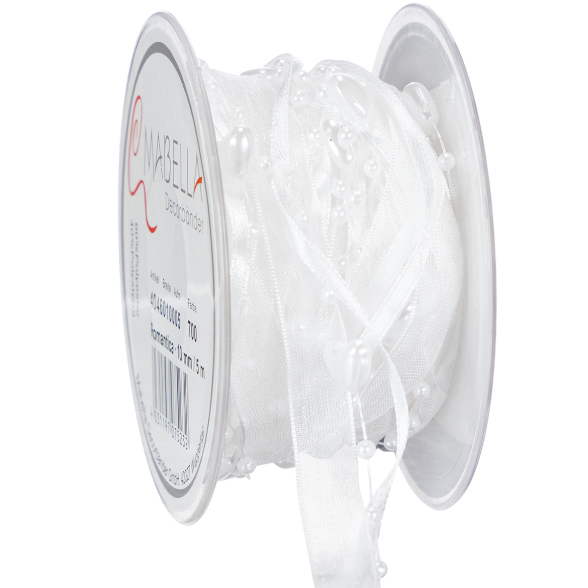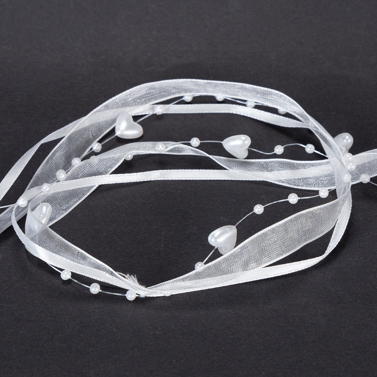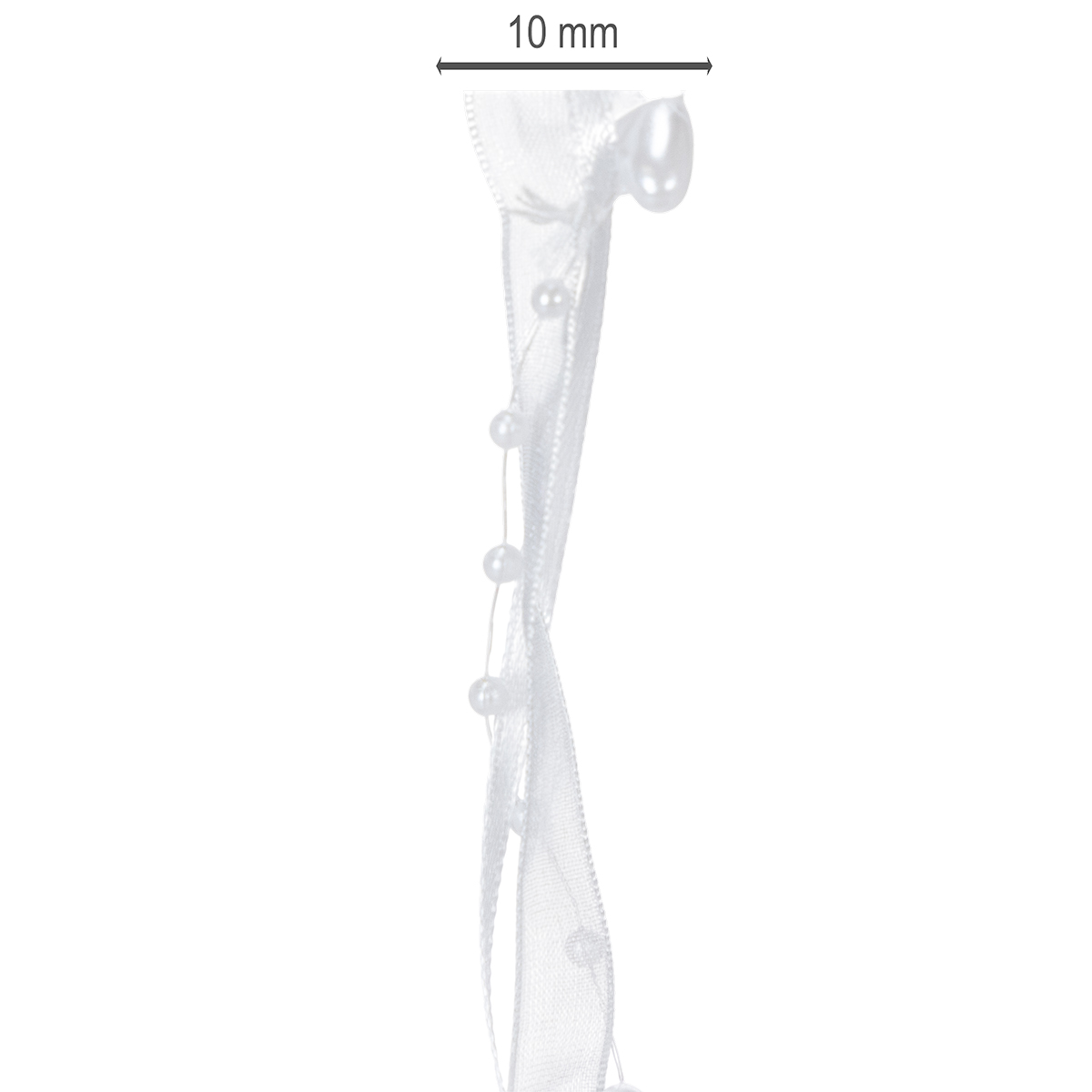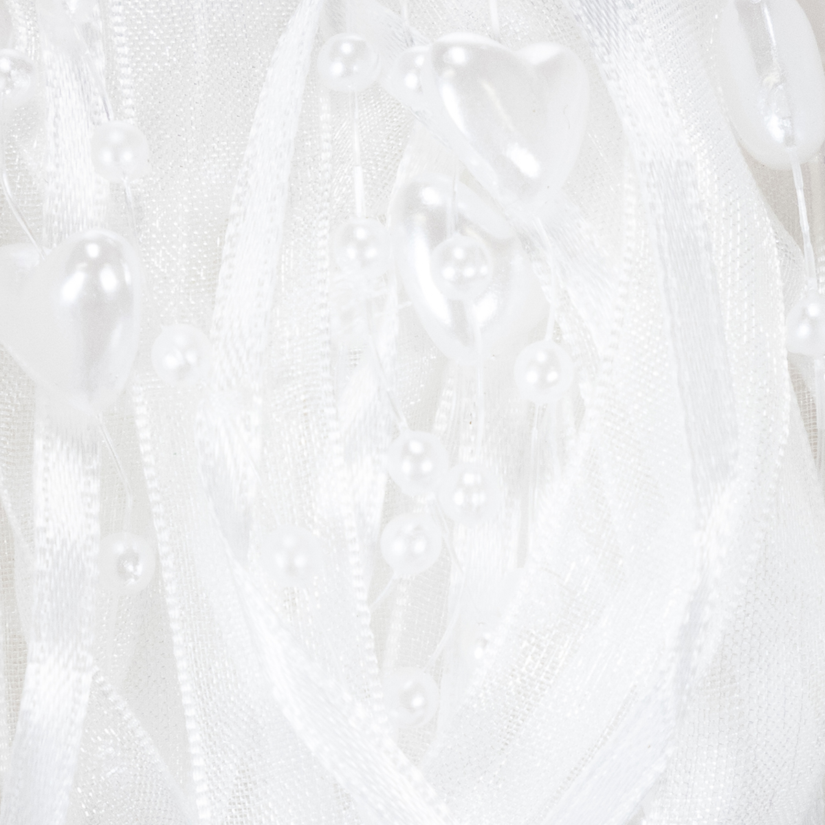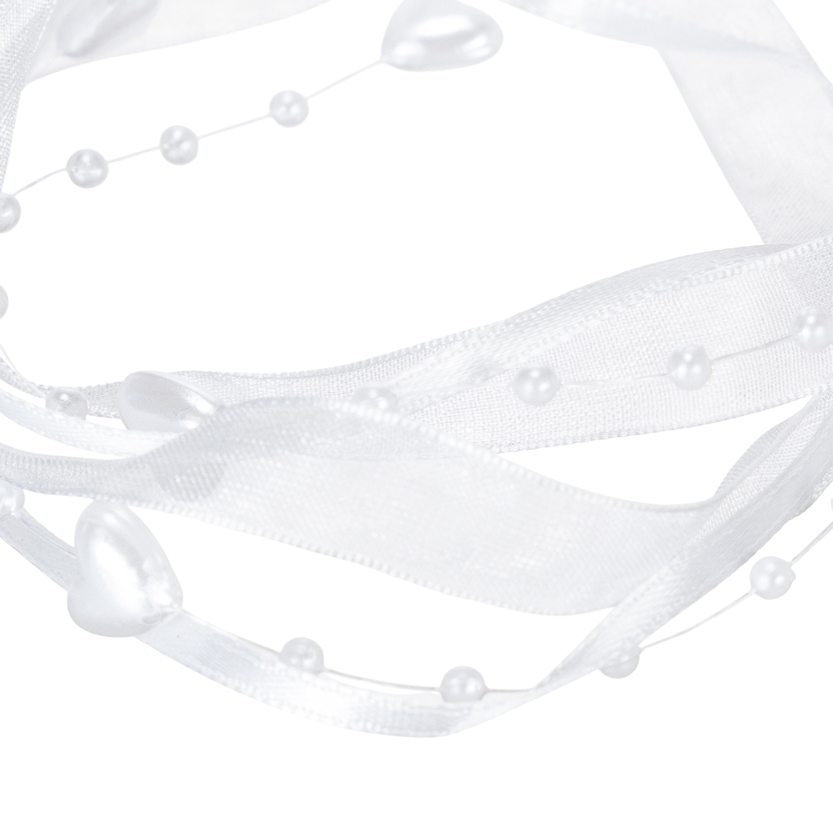 Nazwa produktu: Wstążka organzowa do dekoracji ślubnej biała 10mm x 5m z serduszkami i perłami