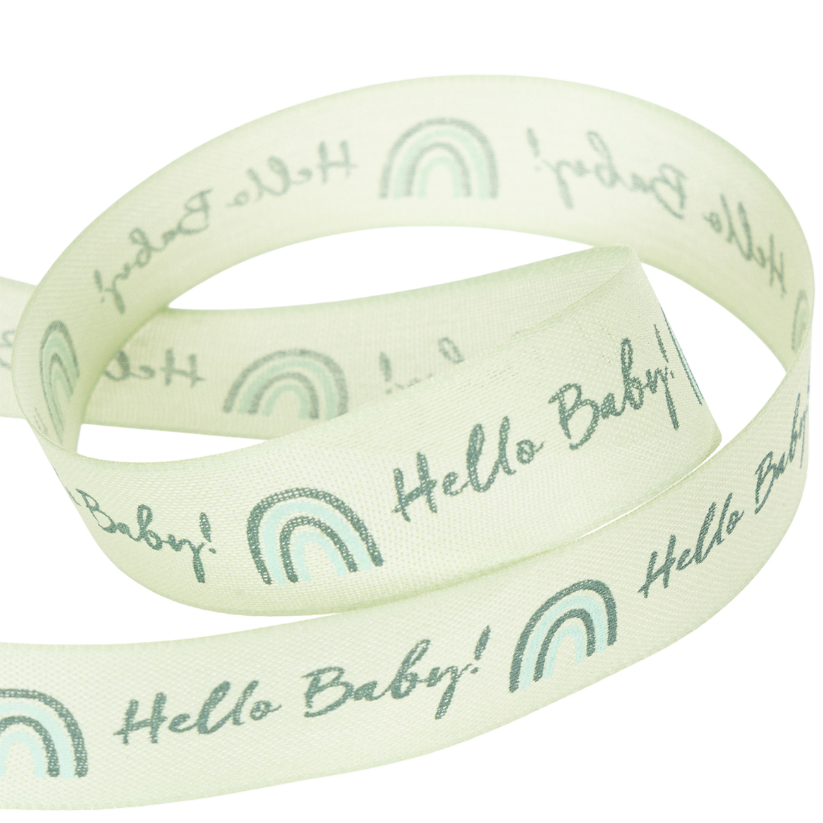 „Hello Baby!” – wstążka prezentowa wita Twojego małego nowicjusza. Pastelowo-zielona ozdobna wstążka ogłasza dobre wieści za pomocą pięknych napisów i nadaje się do ozdabiania, dawania i rękodzieła!