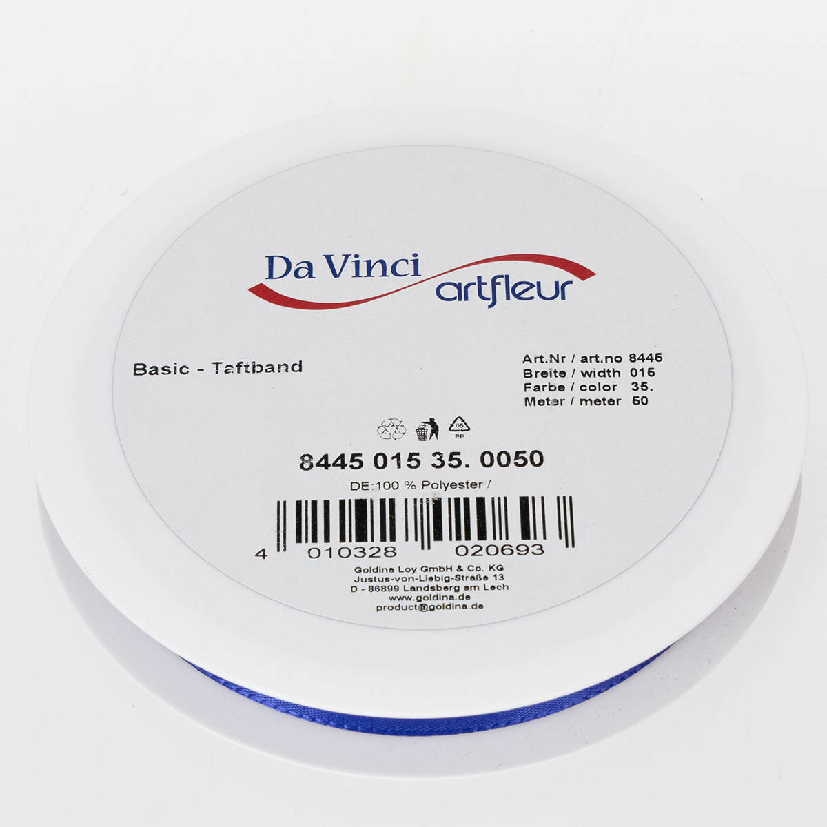 Ładna wstążka do prezentów i dekoracji w kolorze ciemnoniebieskim ma około 15 milimetrów szerokości i około 50 metrów długości. Wykonany jest w 100% z poliestru i dostarczany na poręcznej, płaskiej szpuli z tworzywa sztucznego.