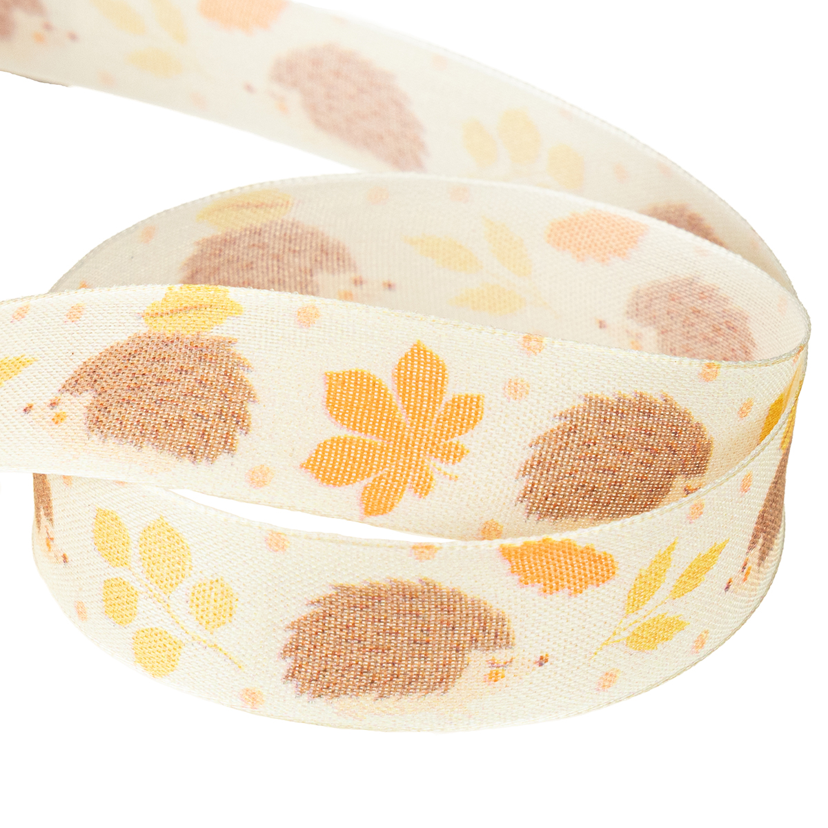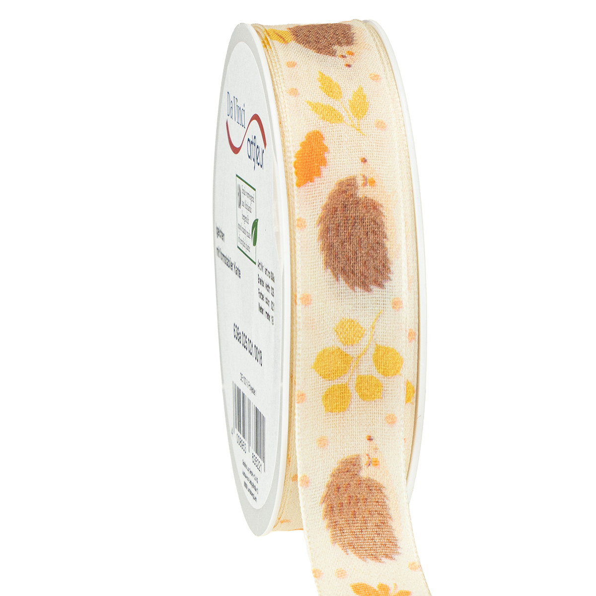 Urocza wstążka prezentowa z jeżem wykonana jest w 100% z poliestru i jest nawinięta na plastikową szpulę. Ma około 15 milimetrów szerokości i około 18 metrów długości.