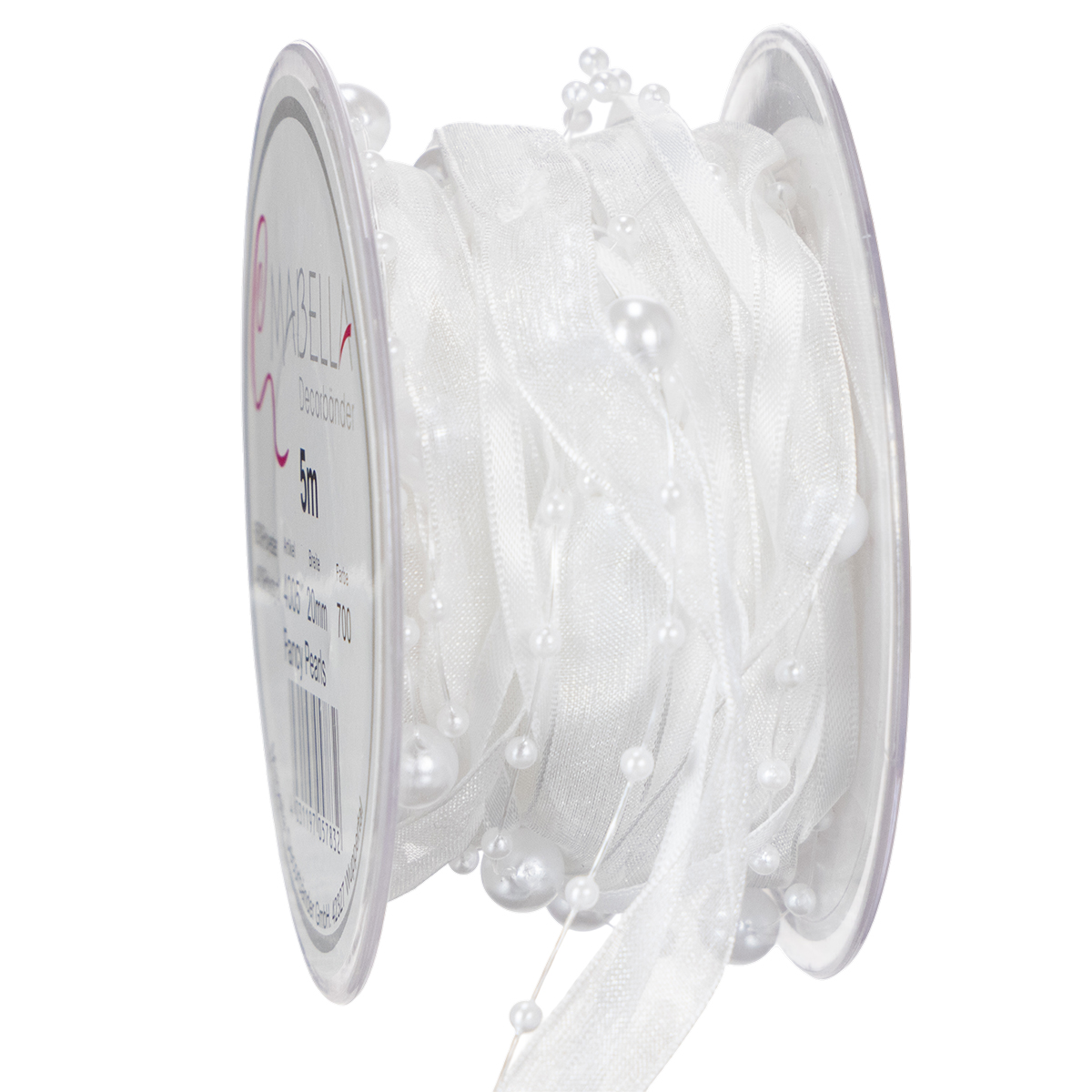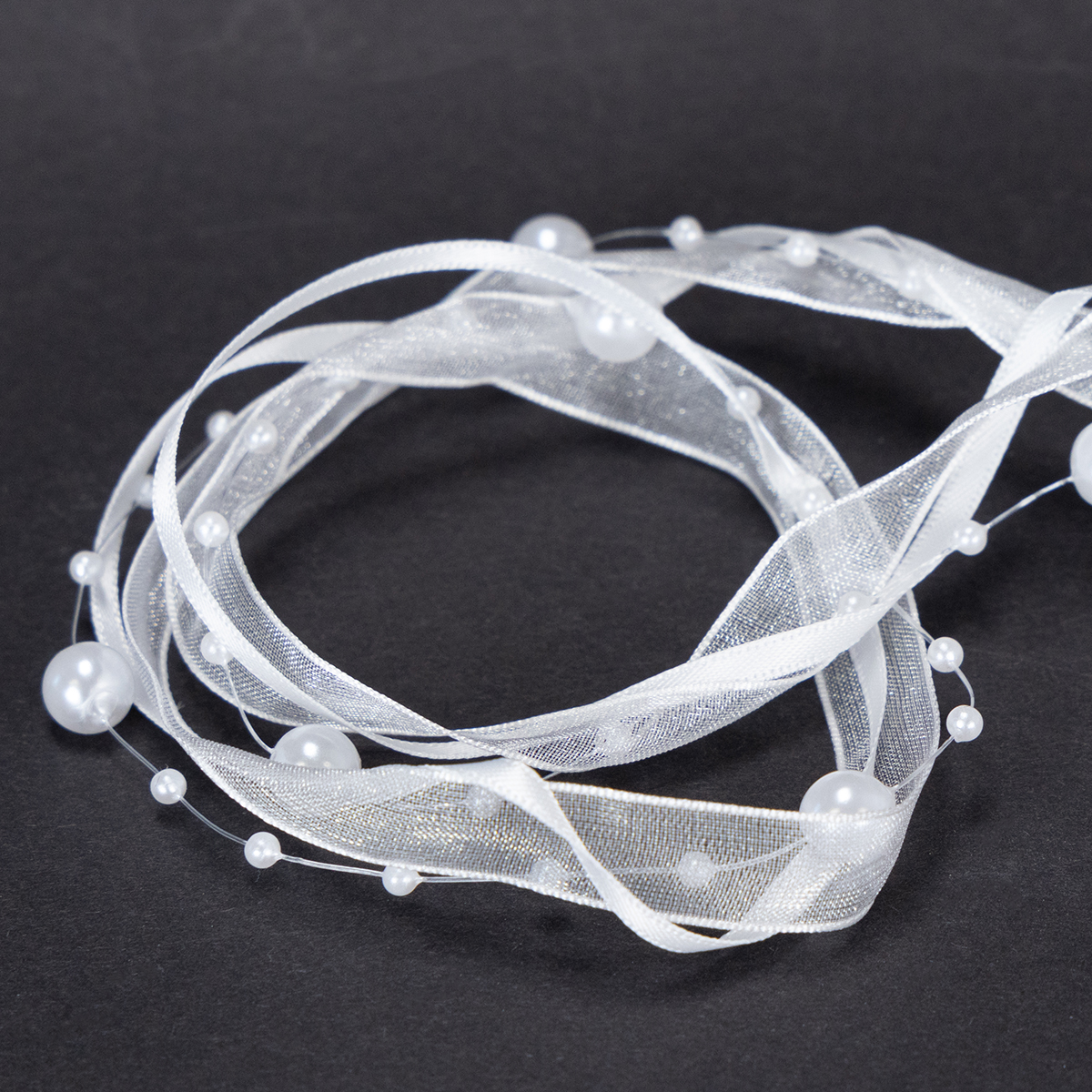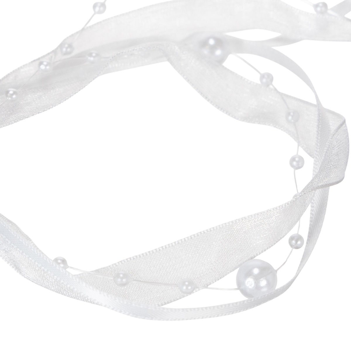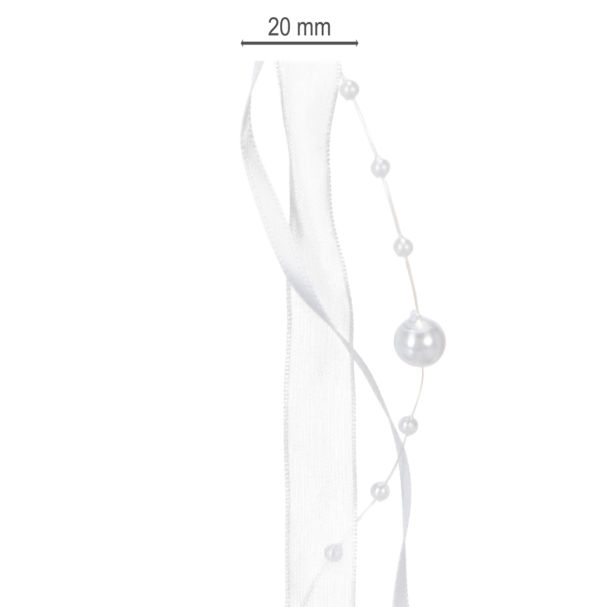 Wstążka ślubna w kolorze białym ma długość około 5 metrów i jest nawinięta na rolce z tworzywa sztucznego. Szerokość wynosi ok. 20 milimetrów, a koraliki mają średnicę od ok. 0,2 do ok. 0,8 centymetra.