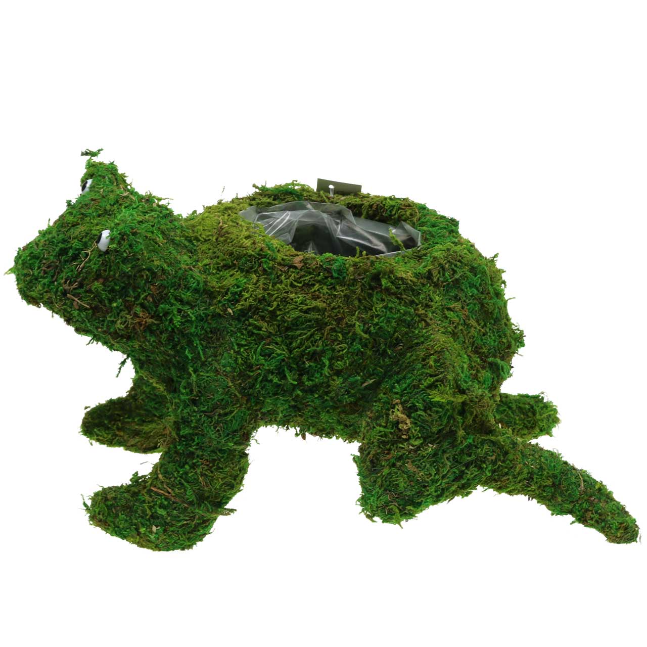 Sympatyczna żaba sadzarka składa się z metalowego szkieletu, który został gęsto pokryty jasnozielonym mchem. Otwór do sadzenia lub na doniczkę wyłożony jest folią do sadzenia. Dwa oczka wykonane z tworzywa sztucznego dopełniają uroczy design ekskluzywnej dekoracji marki VIANA.