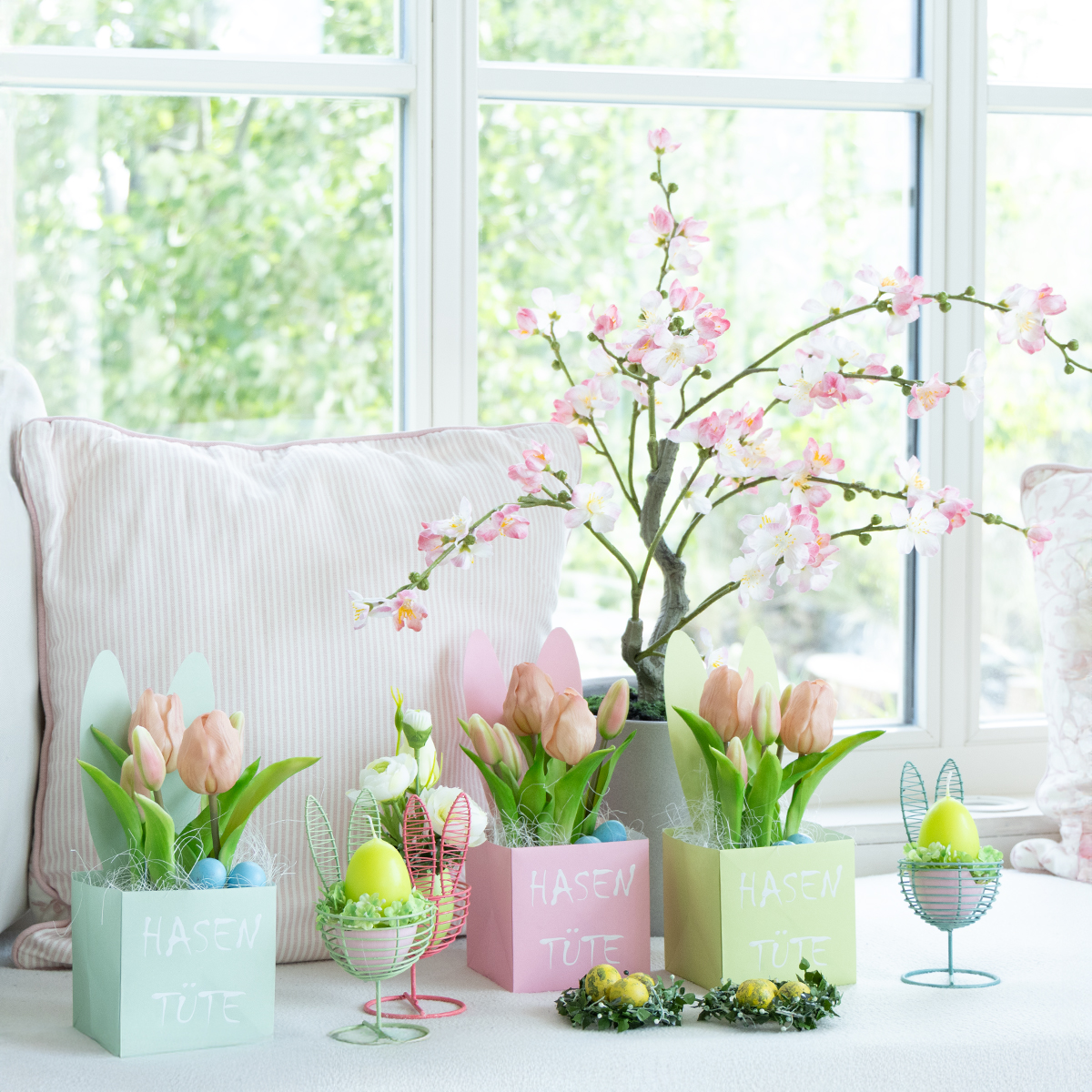Te 16-centymetrowe druciane zajączki nie tylko dodadzą Twojemu domowi radosnego akcentu, ale są również niezwykle wszechstronne. Ich zwiewny design, wykonany z wysokiej jakości metalu, sprawia, że wyglądają zarówno solidnie, jak i lekko. Pastelowe odcienie żółci, różu i zieleni pięknie harmonizują z nowoczesnymi stylami wnętrz – od minimalistycznych po radosne, wiosenne. Szczególnie praktyczna cecha: zajączki są otwarte, co pozwala na wypełnienie ich dowolnymi dekoracjami. Czy to małe czekoladowe jajka, kolorowe piórka, czy nawet delikatny sznur lampek LED – możesz je dostosować do swoich pomysłów. Aby uzyskać bardziej naturalny wygląd, możesz również wypełnić je mchem lub suszonymi kwiatami, tworząc wyjątkową wielkanocną scenerię. Wykorzystaj zajączki jako wyjątkową ozdobę stołu podczas wielkanocnego brunchu lub jako uroczą niespodziankę na parapecie: Twoi goście będą zachwyceni! Uwielbiasz kreatywne projekty DIY? Spróbuj połączyć druciane zajączki z kwiatami z Twojej florystycznej kolekcji. Podobne dekoracje w tej samej gamie kolorystycznej sprawdzą się najlepiej – spróbuj!