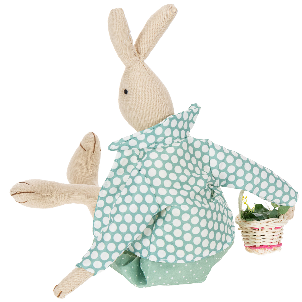 Ten króliczek został wykonany ręcznie z wielką dbałością o szczegóły. Zajączek został wykonany z naturalnej tkaniny i ubrany w żółtą koszulę w białe kropki i drewniane guziki, spodnie i dopasowaną marynarkę w kolorze turkusowym, również w kropki. Zajączek wielkanocny nosi na szyi prostą papierową kokardkę. Człowiek-królik przyniósł mały kosz z kwiatami.
