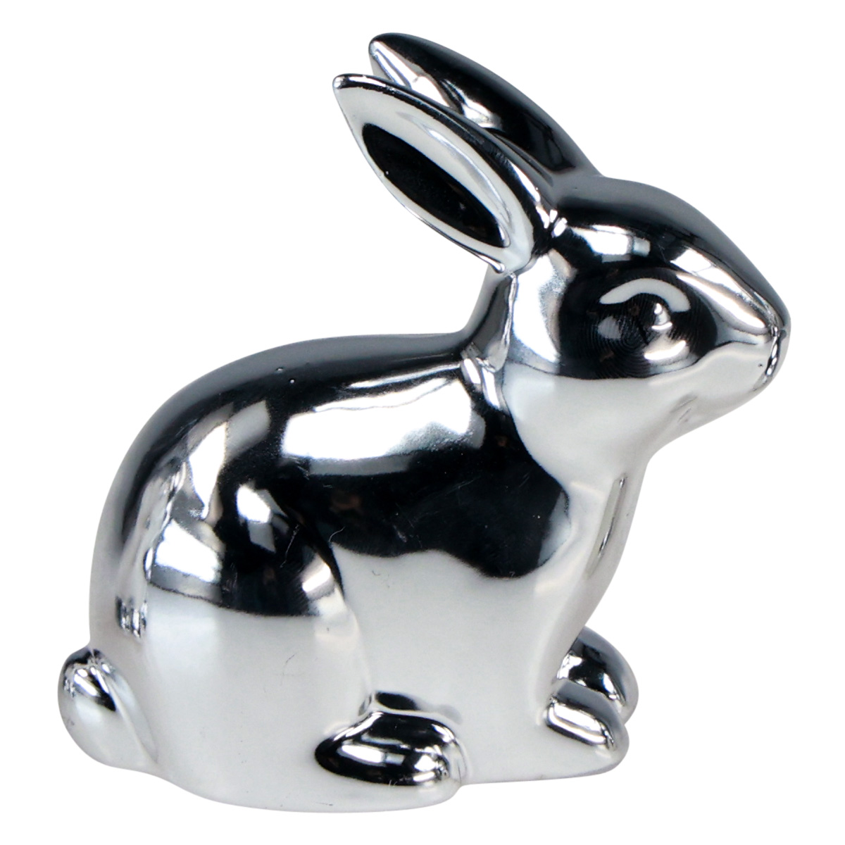 Małe siedzące ceramiczne zajączki wielkanocne błyszczą najpiękniejszym srebrem. Króliki zawdzięczają to eleganckiemu, metalowemu wyglądowi.A srebro idzie wszędzie! Stwórz dekoracje ze świec, używając zielonych lub czerwonych świec z uroczymi króliczkami. Nadaj swojej wielkanocnej tacy na trawę elegancki, nowoczesny lub klasyczny akcent dzięki siedzącym króliczkom o wyglądzie metalu. Srebrne króliki wspaniale prezentują się także w kontraście z czarnymi lub czarno-brązowymi, rustykalnymi drewnianymi dekoracjami.
