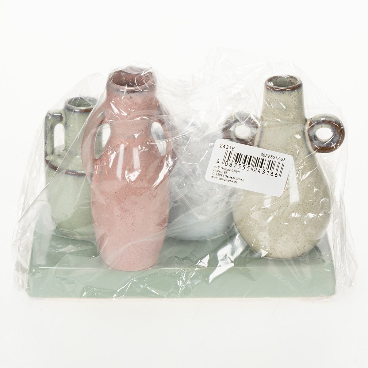 Ten mini ceramiczny zestaw wazonów składa się z czterech małych wazoników ułożonych na prostej, zielonej tacy. Każdy wazon ma niepowtarzalny kształt – od cebulkowatego po smukły, z ozdobnymi uchwytami lub prostymi liniami. Ta różnorodność sprawia, że zestaw tworzy harmonijną całość, zachowując jednocześnie swój indywidualny charakter. Różowo-zielono-biała kolorystyka przywołuje wiosenną świeżość, nie przytłaczając jej. Zdecydowany plus: wysokiej jakości ceramika o gładkiej, błyszczącej powierzchni nadaje zestawowi elegancki charakter. Niezależnie od tego, czy wypełniona świeżymi, wiosennymi kwiatami, suszonymi gałązkami, czy nawet bez kwiatów, te małe wazony zawsze przyciągają wzrok. Idealnie wpisują się w nowoczesne, minimalistyczne lub skandynawskie aranżacje wnętrz. A dla tych, którzy preferują przytulniejszą atmosferę, zestaw można również wykorzystać w stylu rustykalnym, na przykład w połączeniu z drewnianymi lub dzianinowymi elementami. Po prostu zachwyca w połączeniu z jasnymi podkładkami lub złotymi świecznikami. Dzięki kompaktowym wymiarom (14 cm długości, 7 cm szerokości i 11 cm wysokości) zestaw ten zmieści się praktycznie wszędzie: na wąskich kredensach, jako dekoracja stołu w jadalni lub jako stylowy akcent na półkach. Solidna konstrukcja gwarantuje również długotrwałą przyjemność użytkowania. Każdy, kto szuka subtelnej, a zarazem stylowej dekoracji, będzie zachwycony.