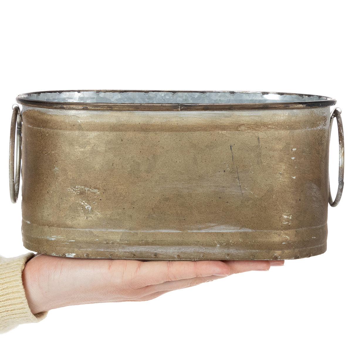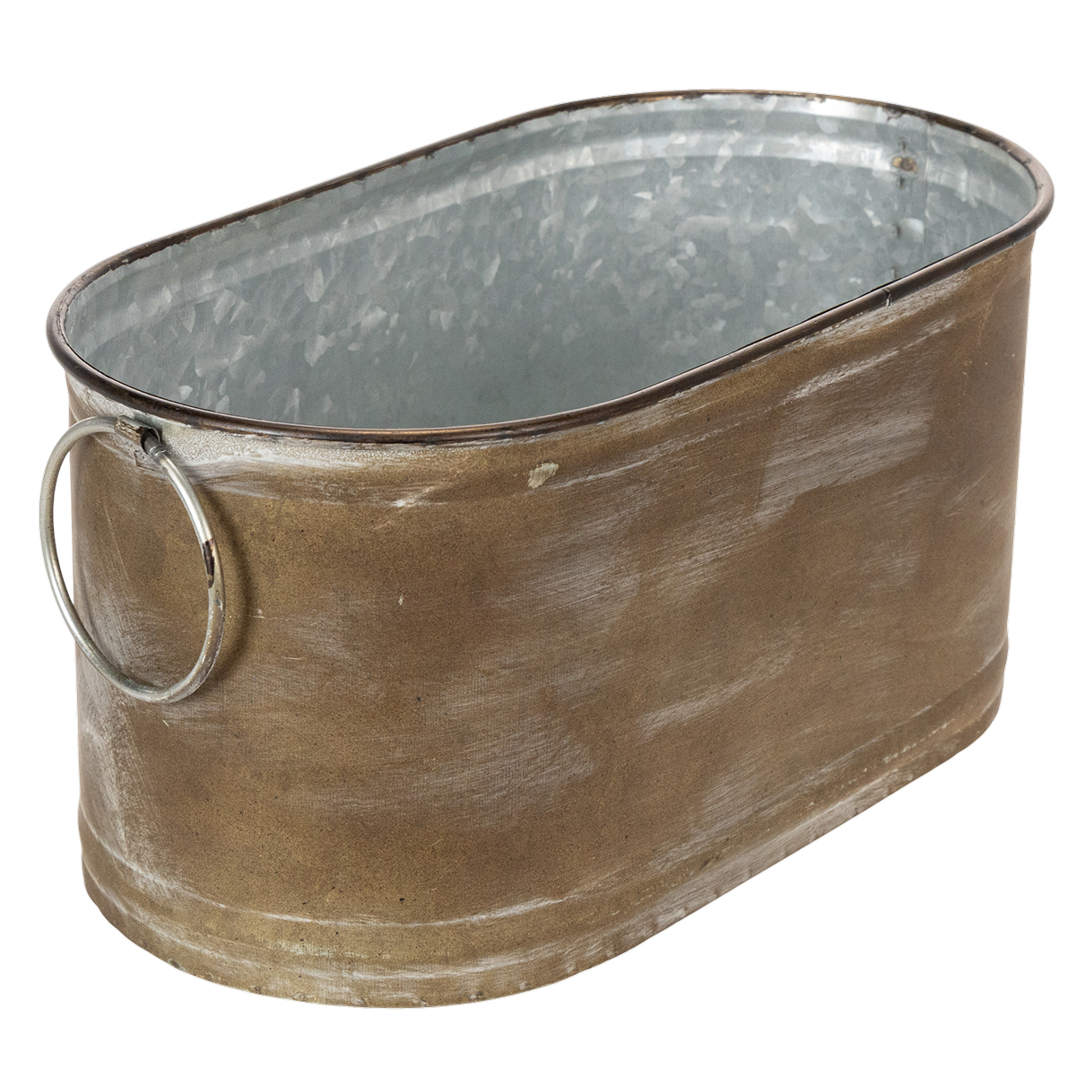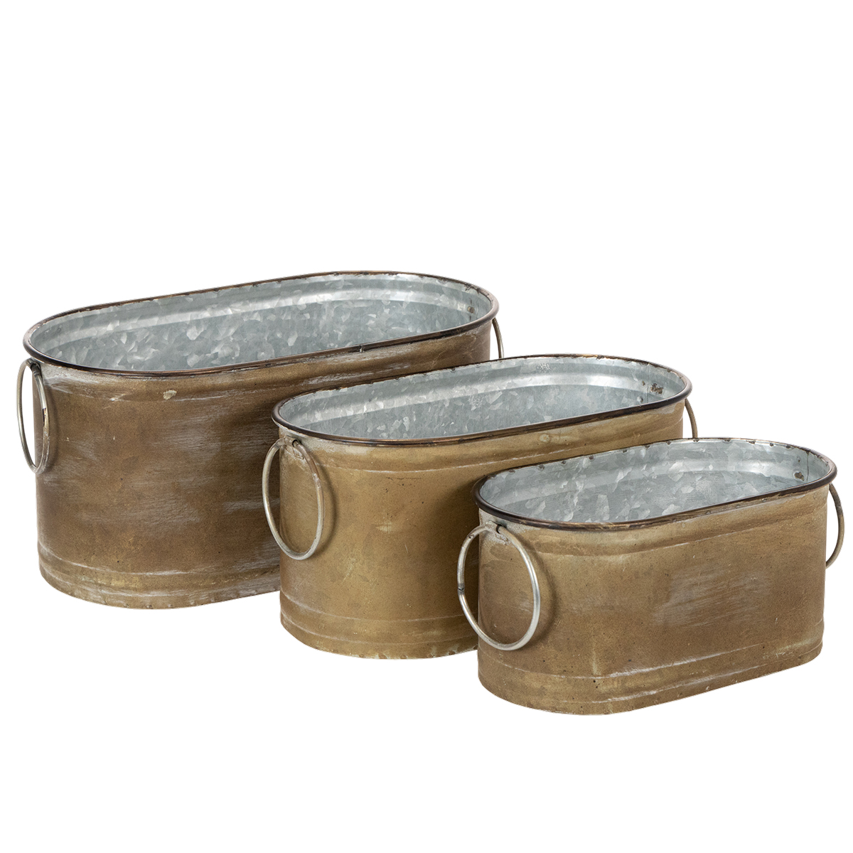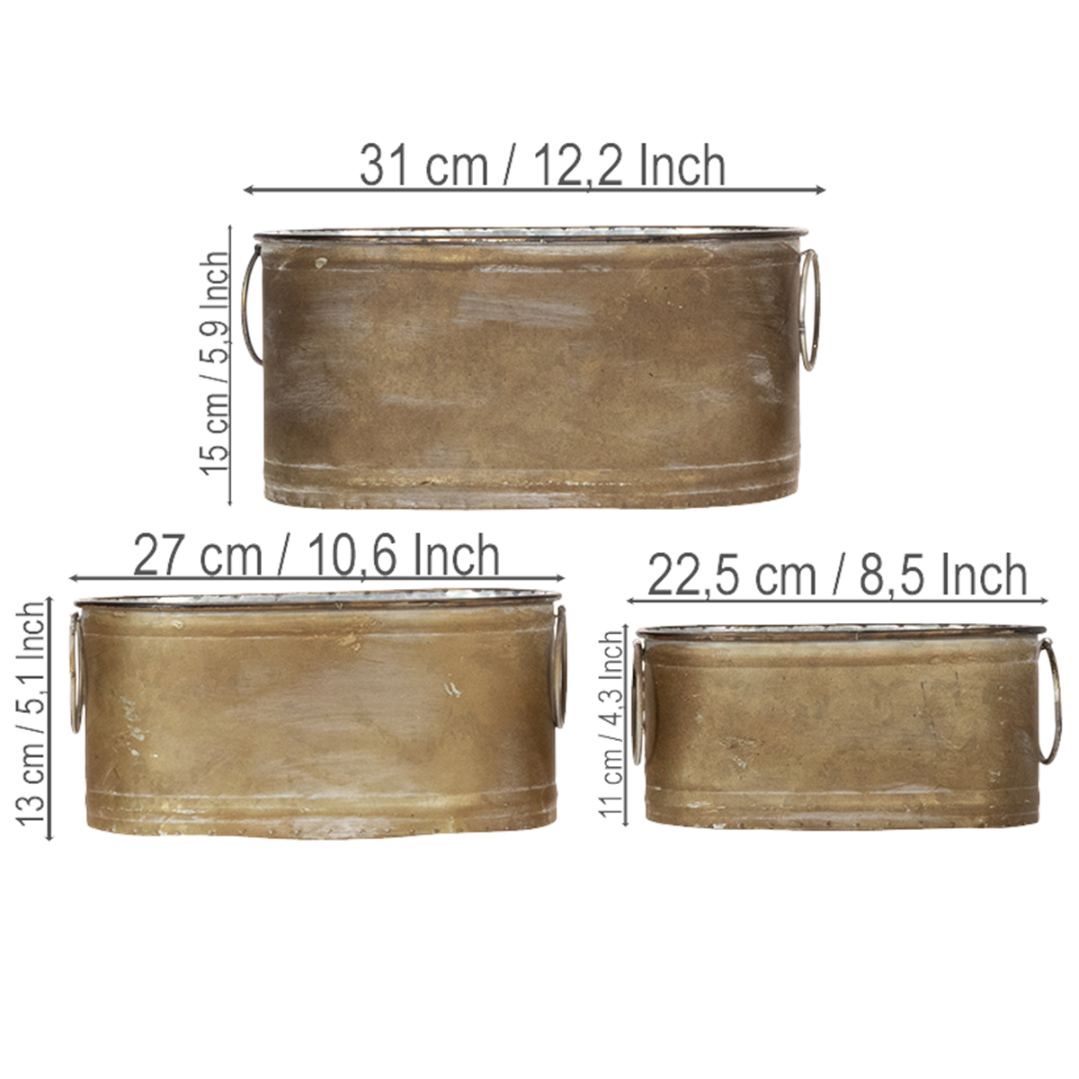 Cachepots w zestawie 3 mają kształt małych wanien. Zewnętrzna część metalowych wanien jest myta w kolorze miedzianym. Kolor i kształt są utrzymane w stylu retro, dzięki czemu nadają się na zabytkowe nakrycie stołu. Retro charakter podkreślają duże ruchome pierścienie pełniące funkcję uchwytów.