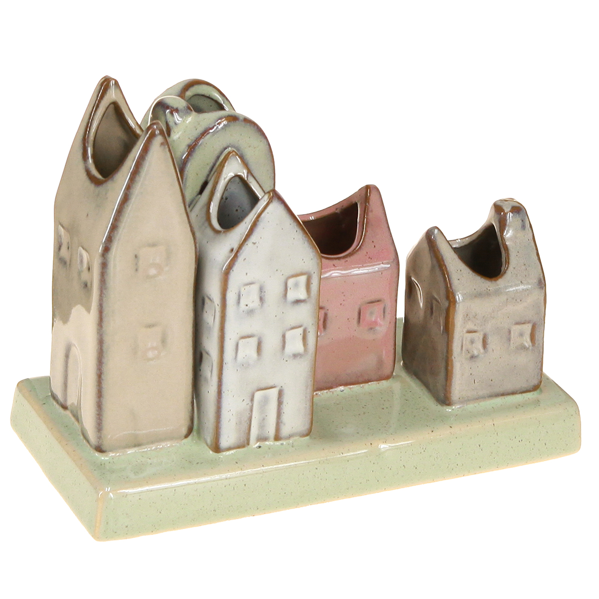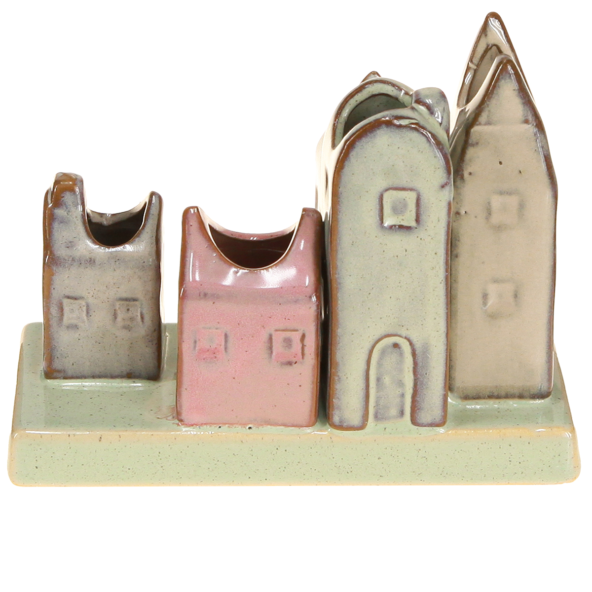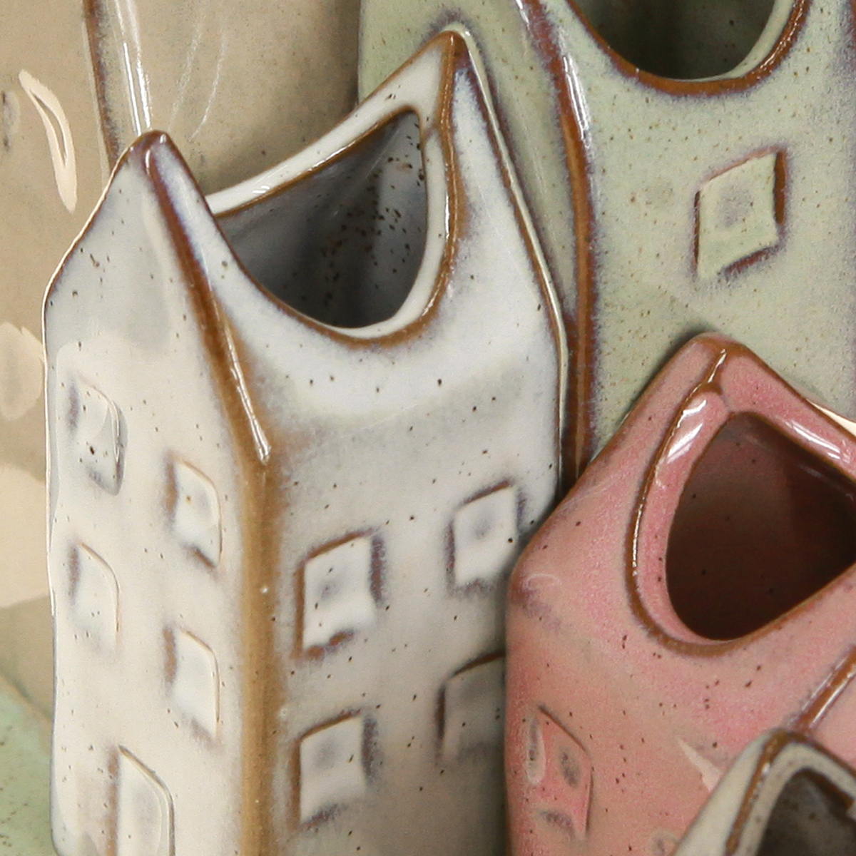 Każdy z pięciu małych wazonów w kształcie domku posiada wąską, cylindryczną wkładkę, dzięki czemu idealnie nadają się do prostych kwiatów, takich jak stokrotki czy delikatne gałązki. Aby nadać ceramice bardziej kreatywnego charakteru, można dodać suszone kwiaty lub trawy, podkreślając jej miejski szyk. Wysokiej jakości ceramika nadaje wazonom solidny, a zarazem elegancki charakter. Zestaw prezentuje się szczególnie dobrze na drewnianym lub szklanym stole, ale pięknie błyszczy również w połączeniu z innymi elementami dekoracyjnymi, takimi jak małe podgrzewacze. Puść wodze fantazji i stwórz nakrycie stołu, które idealnie odzwierciedli Twój gust!