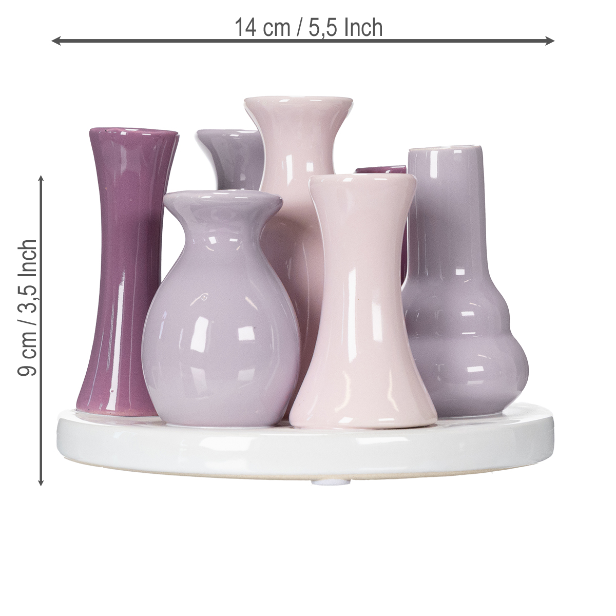 Szukasz wyjątkowego akcentu do swojego domu? Czegoś, co doda świeżości, elegancji i nuty nowoczesności? Ten pastelowy zestaw wazonów z wysokiej jakości ceramiki może być właśnie tym, czego szukasz. Sześć kunsztownie ukształtowanych wazonów w połączeniu z solidną, białą, ceramiczną podstawą gwarantuje wszechstronne zastosowanie – od dekoracji stołu po przyciągające wzrok akcenty na półkach. Niezależnie od tego, czy wypełnisz je świeżymi kwiatami, małymi bukietami suszonych kwiatów, czy po prostu ustawisz jako stylową dekorację, te małe wazony zawsze dodadzą idealnego akcentu. Harmonijna paleta barw różu i fioletu tworzy uspokajającą, a jednocześnie przyjazną atmosferę. Idealny wybór dla każdego, kto ceni styl i funkcjonalność oraz chce nadać swojej przestrzeni życiowej nowoczesny wygląd.