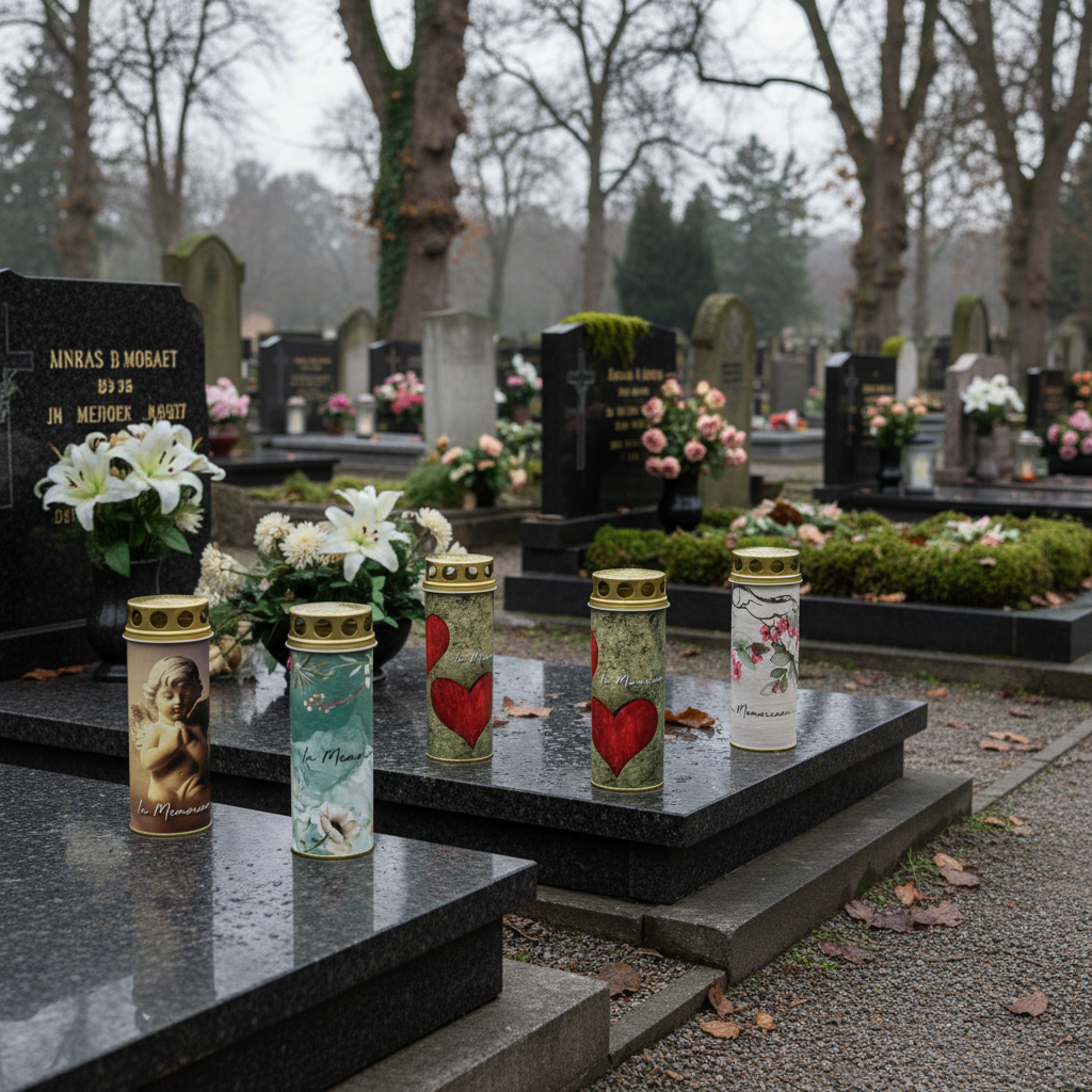 Drukowane znicze można umieścić bezpośrednio na grobie jako nastrojowe oświetlenie lub umieścić je w przezroczystej latarni. Światło grobowe jest szczególnie efektowne, gdy jest całkowicie widoczne, a odpowiedni motyw harmonizuje z otoczeniem.