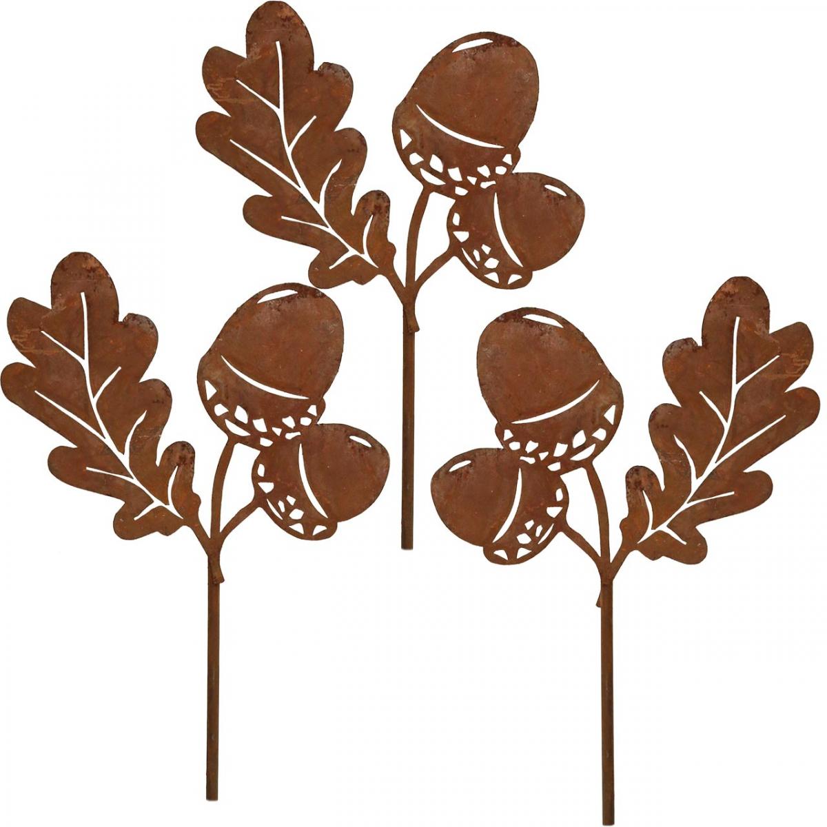 Zatyczki ogrodowe żołędzie z liściem w szlachetnej rdzy otrzymasz w zestawie 6 sztuk. Kwiatostan z żołędziami ma całkowitą długość około 19 centymetrów. Żołędzie z liśćmi mają długość około 11 centymetrów i szerokość około 13 centymetrów.
